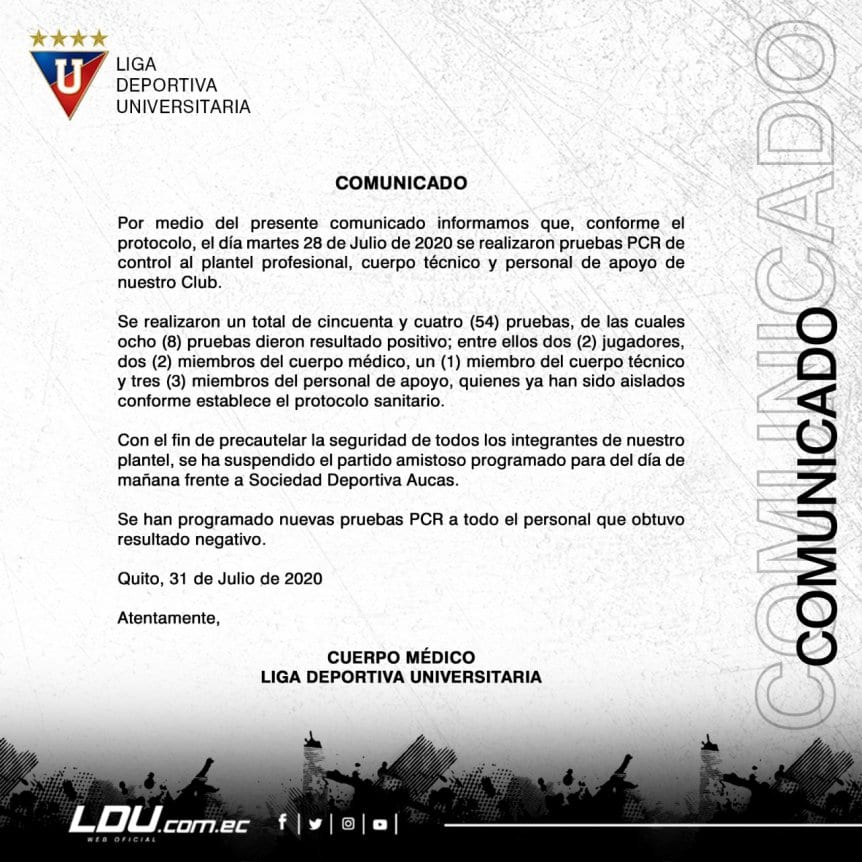 Liga de Quito, que debería visitar el Monumental en la última fecha del Grupo D, informó que tras los estudios realizados a todo el plantel, cuerpo técnico, médico y ayudantes, ocho de estos resultaron haberse contagiado de Covid-19.