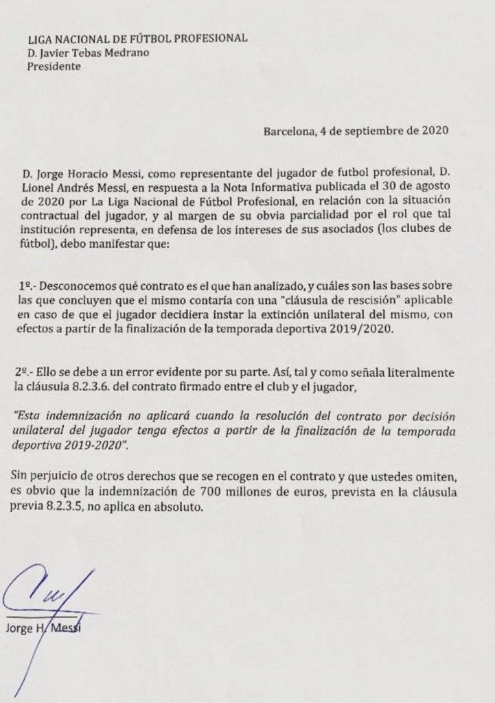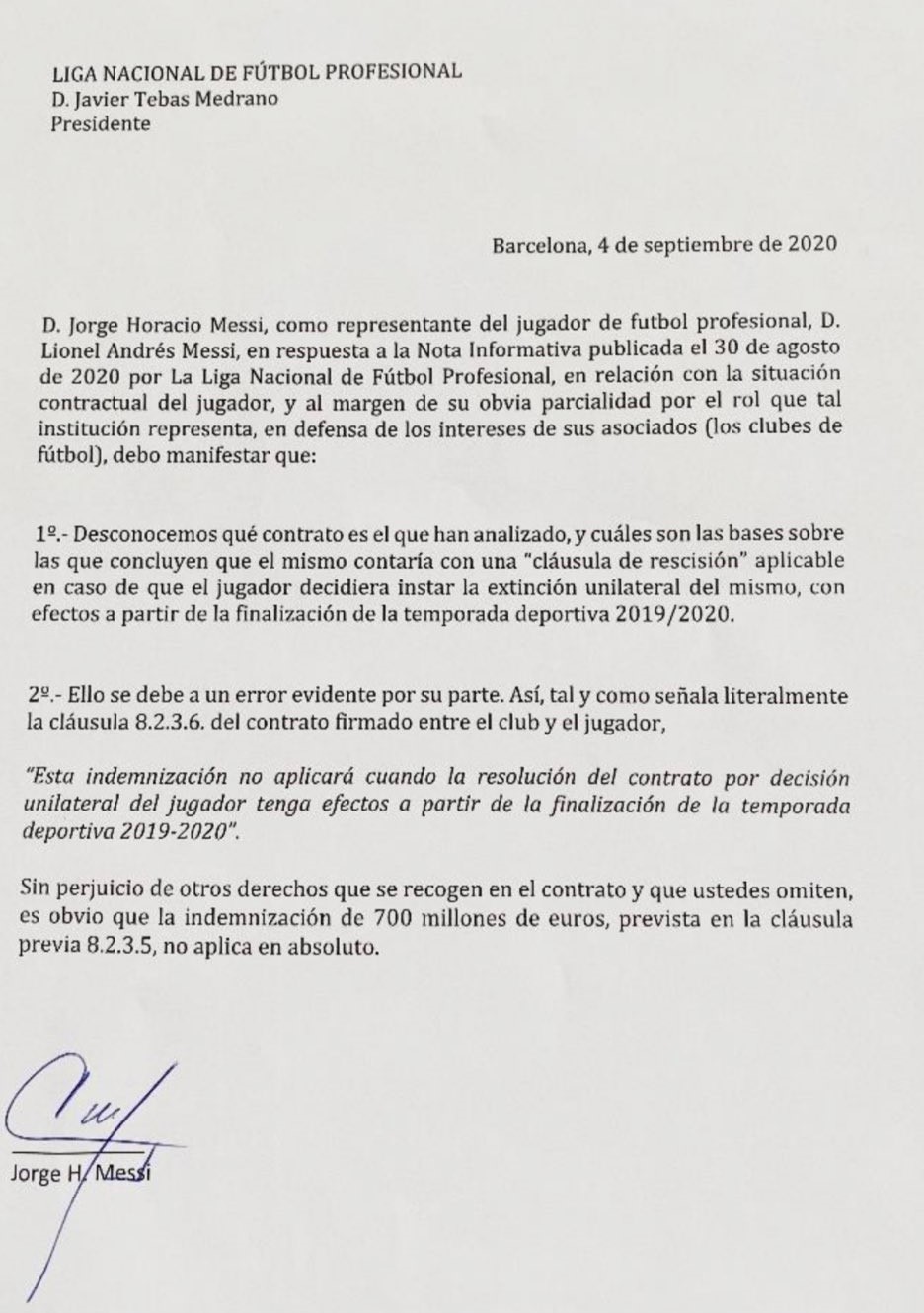 El padre de Leo emitió un comunicado en el que insiste en dos puntos claves: no entiende por qué no tiene derecho a la rescisión unilateral y además confirma que la cláusula de 700 millones para salir, no existe.
