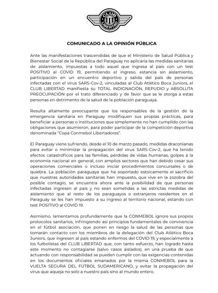 «El club Libertad no es reacio a disputar, en la fecha prevista de este jueves, su encuentro con el Club Atlético Boca Juniors, pero no consentirá ni admitirá la aplicación de excepciones inadmisibles que pongan en riesgo la salud de sus futbolistas y demás personas vinculadas, porque la salud y la vida humana misma están por encima de todo».