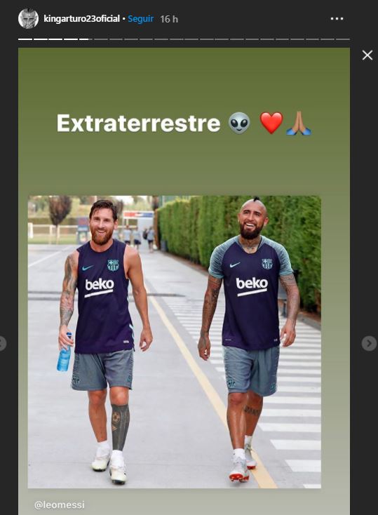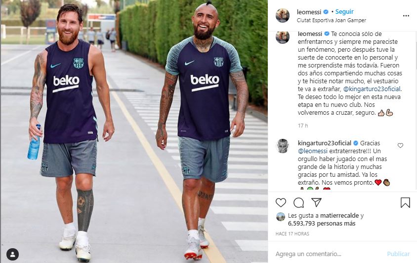 «¡Gracias extraterrestre! Un orgullo haber jugado con el más grande de la historia y muchas gracias por tu amistad. Ya los extraño. Nos vemos pronto», contestó Vidal a Messi en su publicación de Instagram.