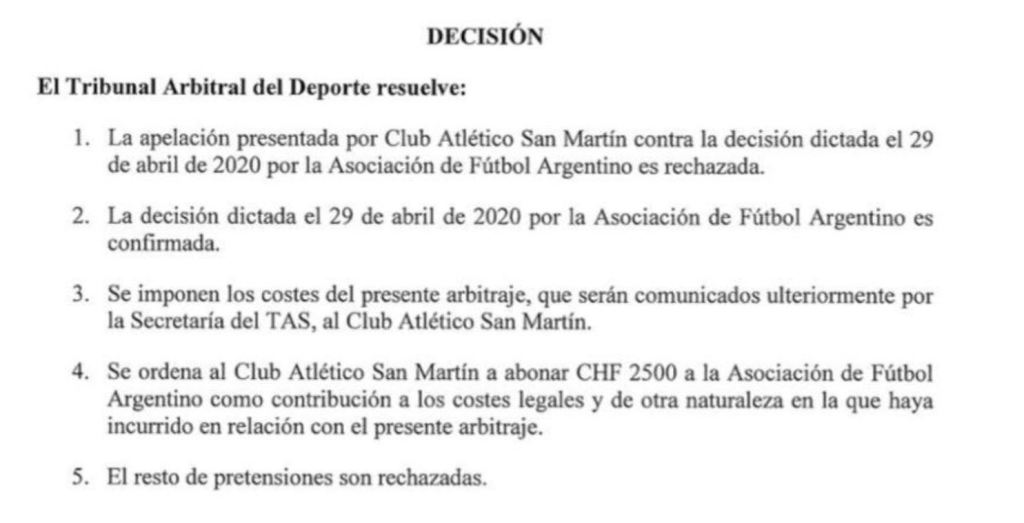 Sin embargo, el TAS explicó: «La decisión de la AFA está confirmada y los costes del presente arbitraje serán abonados por San Martín».