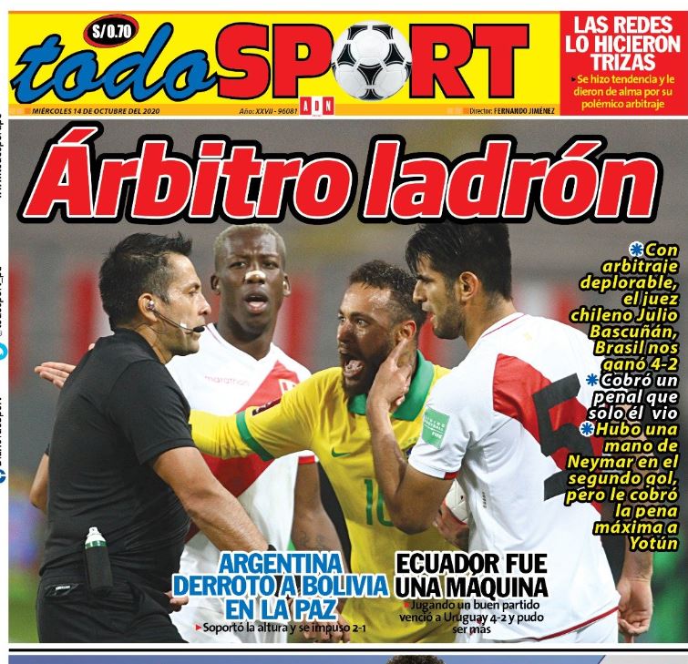 “Hasta los 80 minutos el partido estaba empatado, pero Bascuñán inclina escandalosamente a favor de Brasil. Un robo de un ladrón vestido de negro”, escribió Tuesta, de acuerdo a lo publicado por EFE.