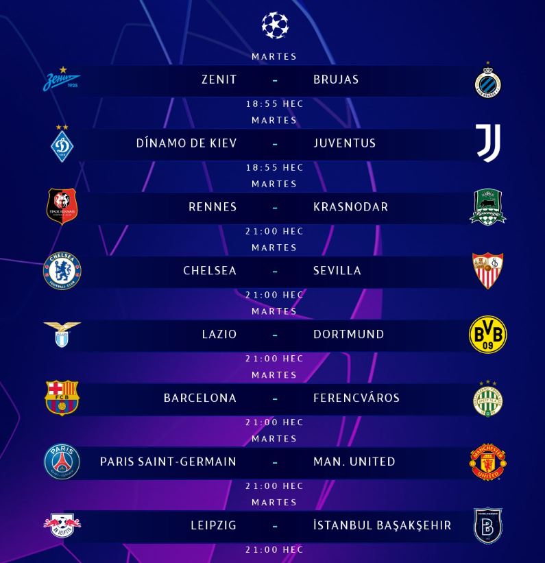 En el Grupo G se producirá el estreno del Barcelona de Lionel Messi como local ante Ferencváros de Hungría, mientras que, en el primer turno de las 13.55, Juventus, con el cordobés Paulo Dybala pero sin Cristiano Ronaldo, ausente por Covid-19, visitará a Dinamo Kiev en Ucrania.