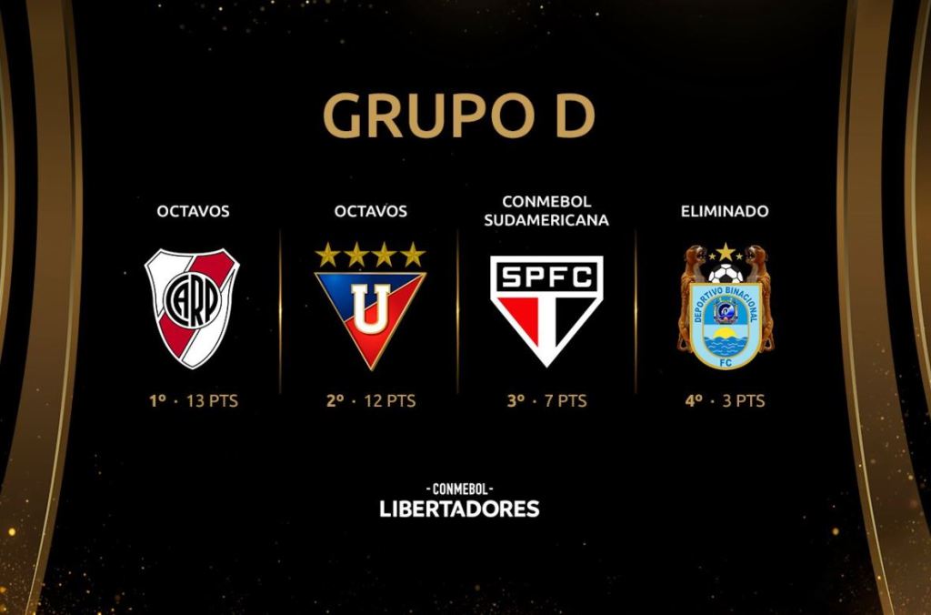 De esta manera River se quedó con el grupo al alcanzar los 13 puntos, contra 12 de Liga de Quito, mientras que San Pablo finalizó con 7 y se clasificó a la Copa Sudamericana, en tanto que Binacional, de Perú, con 3 unidades, quedó eliminado.
