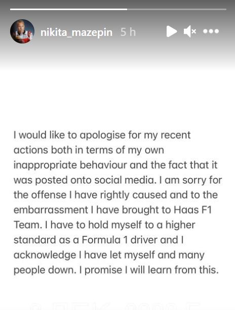 Mazepin, de 21 años, posteó una historia en su cuenta de Instagram donde se lo ve en un auto particular filmando cómo desde el asiento de copiloto molesta a una mujer mientras ella intenta impedir que le manosee el pecho. El piloto borró las imágenes, pero se viralizaron y fueron vistas por los líderes de la escudería estadounidense.