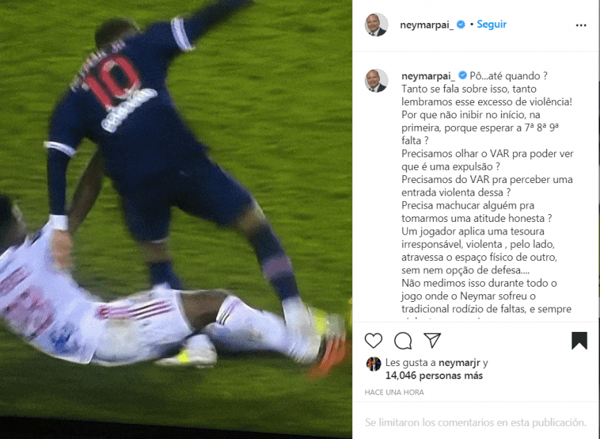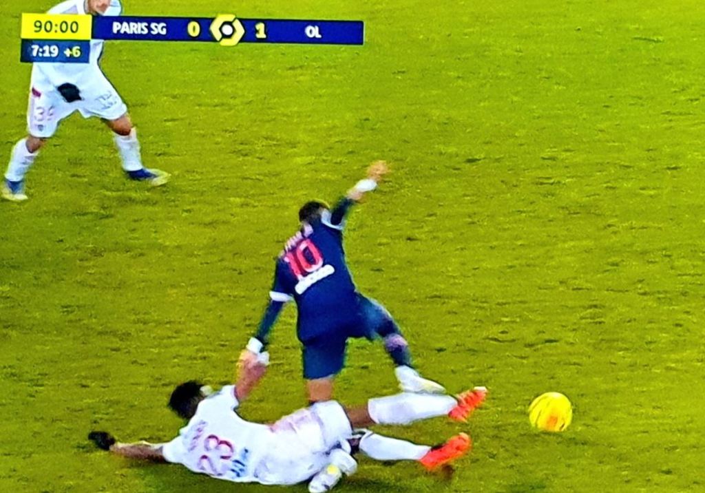 Minutos antes del final del encuentro, que Lyon ganó por 1-0, el defensor Mendes entró muy duro sobre el tobillo de Neymar y recibió la tarjeta roja.