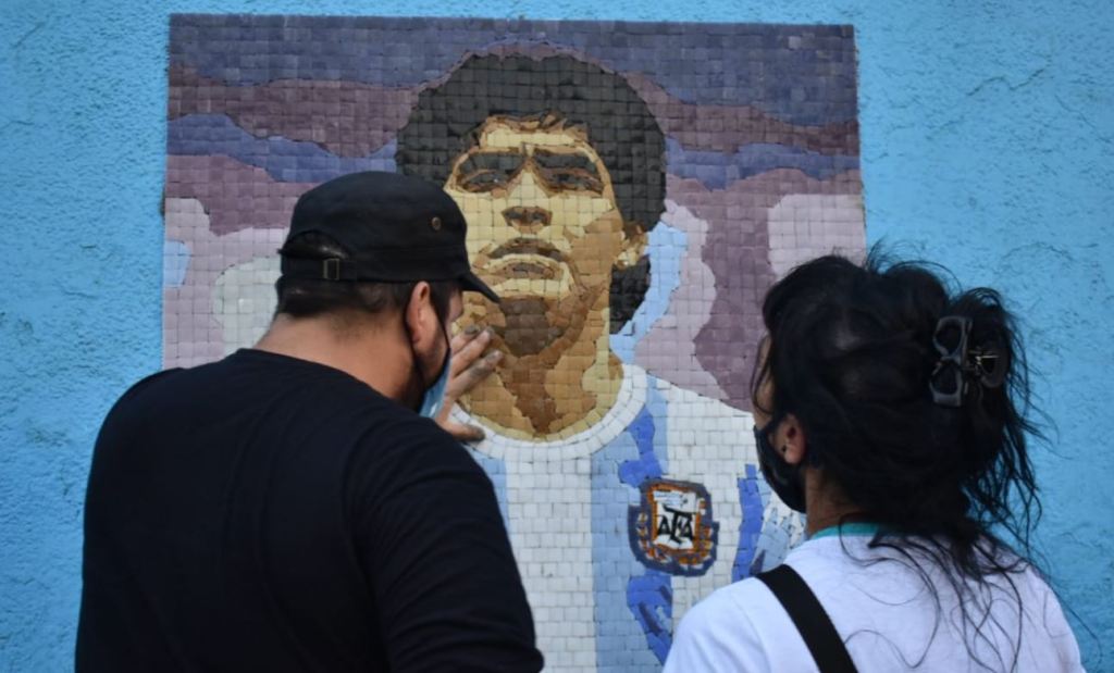 El trabajo, hecho en venecitas, exhibe la figura del astro del fútbol mundial con la camiseta que utilizó en el seleccionado argentino campeón del mundo en México 1986, hace ya casi 35 años.