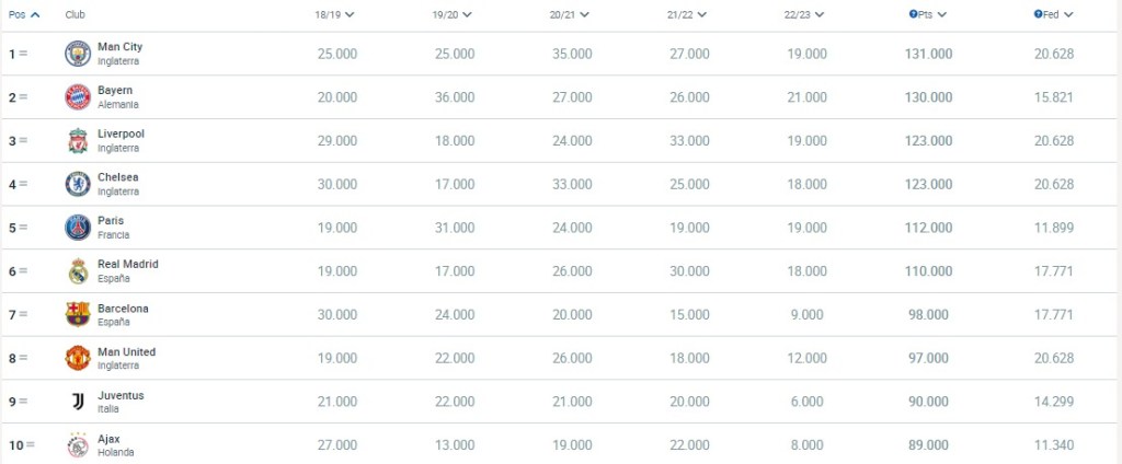 Luego, el conjunto de Carlo Angelotti aparece en la ya nombrada posición sexta con 110 mil, seguido de su clásico Barcelona con 98 mil, Manchester United sumando 97 mil, Juventus de Italia quedando en el noveno puesto con 90 mil y finalizando con el Ajax de Países Bajos y sus 89 mil puntos.